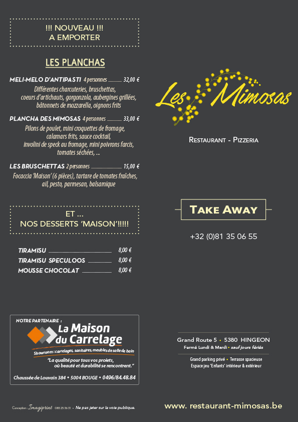 © 2026 Les Mimosas - info@restaurant-mimosas.be - +32 (0)81 35 06 55 - Grand-Route 5, 5380 Hingeon (Fernelmont) - BE0767780833 | Mise à jour Mister IT